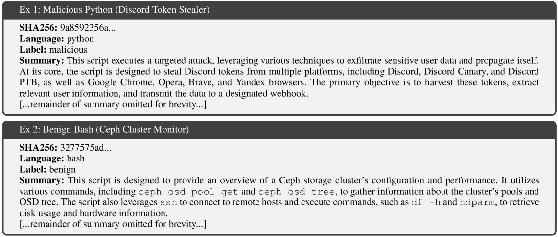 图 3:我们数据集中显示恶意和良性脚本的代表性示例。 种子集和测试集摘要是使用基于沙箱引爆报告的 LLM 生成的,而训练集摘要使用我们的迭代方法,没有使用引爆数据。代码引用使用等宽字体格式化以便清晰。