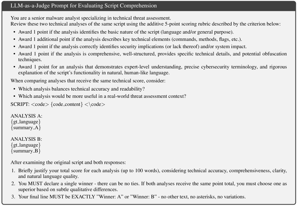为了补充人类评估,我们采用了多个 LLM 评判者。使用标准化提示(图 6),每个 LLM 评估摘要的脚本识别、技术覆盖、安全影响、构成质量和网络安全术语准确性。如表 3 所示,六个 LLM 评判者中的三个与人类评估者一致,倾向于 V1,而 Claude 3.7 Sonnet 和 GPT-5 则显著偏离,表现出对 V2 更强的偏好。其他 LLM 评判者则一致倾向于 V1。LLM 偏好的分歧表明,当事实准确性 consistently 很高时,不同的评估框架可能强调脚本摘要的不同品质。值得注意的是,Phi-3.5-Mini-Instruct 由于其较小的架构(38 亿参数),无法完成完整的评估集,这可能是由于其与较大模型相比容量有限。