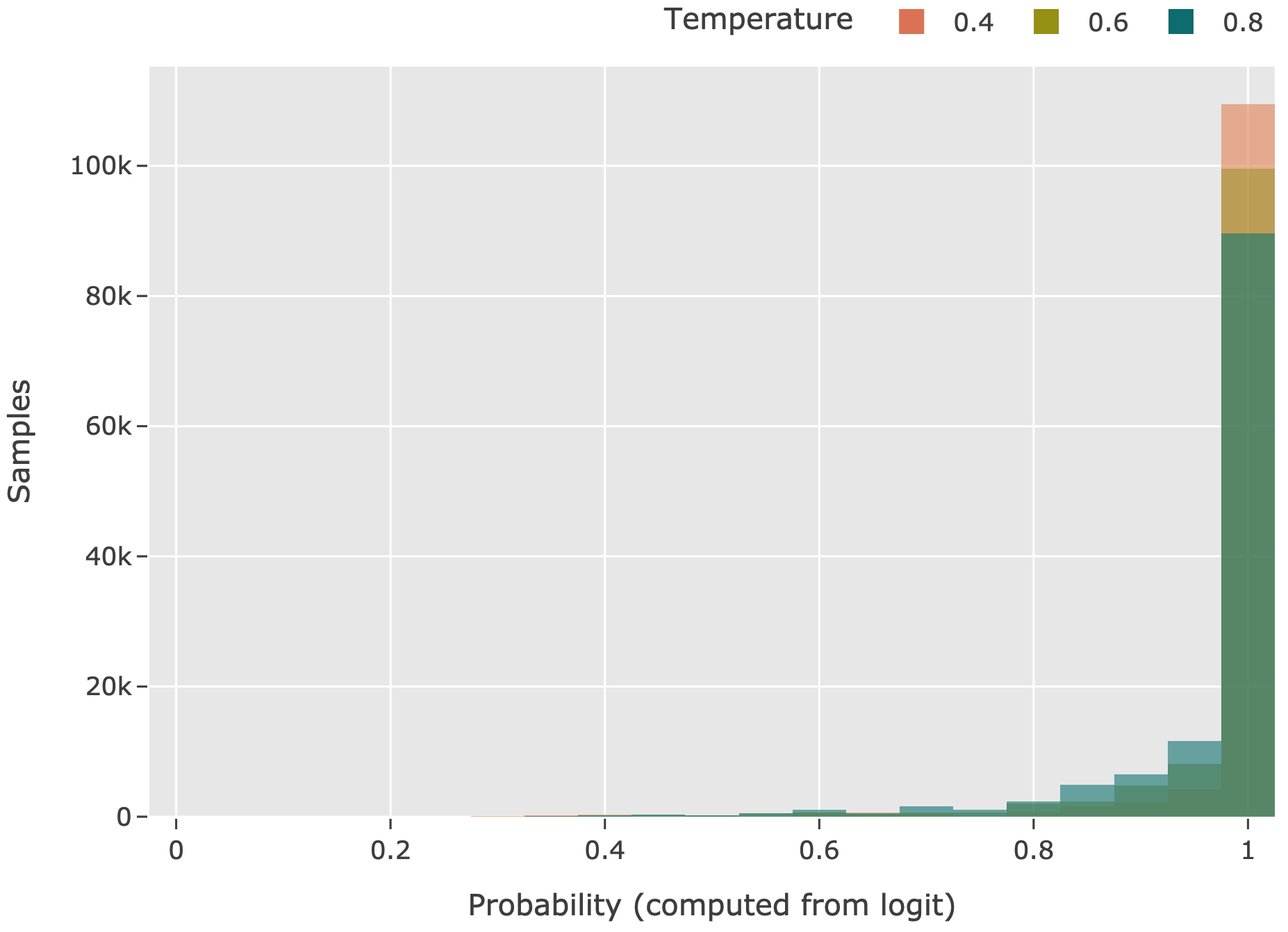 我们的过滤流程包括多个阶段。初始清理删除了空响应(9,095)、截断的摘要(17)和不完整的 JSON(7,825),使数据集减少了 10.76%。跨三个温度(0.4, 0.6, 0.8)的一致性检查消除了恶意标签不一致的样本,使数据再减少 14.28%。使用 Phi-3.5-Mini(因其在我们的测试集上达到 99.5% 的准确率而被选中),我们删除了 219 个(0.22%)摘要与恶意性标签存在差异的样本。最后,我们应用了 90% 的 logit 概率置信度阈值,大多数值聚集在 1 附近(图 5)。最终过滤后的数据集包含 101,277 个示例(表 1)。这种过滤策略在正确性和数据集大小之间取得了平衡,但阈值可能需要针对不同应用进行调整。