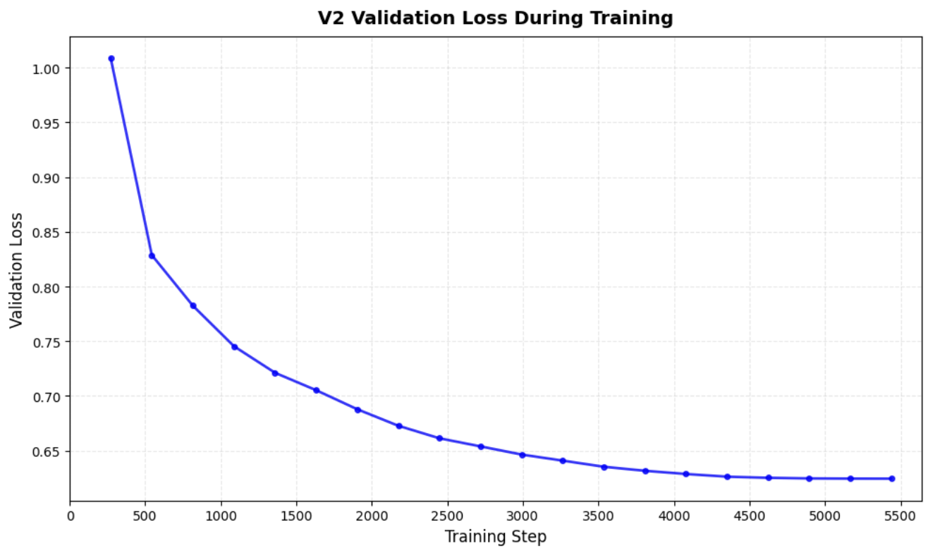 相比之下,在扩展数据集(种子数据加上 100K V1 生成样本)上训练的标注器 V2(图 17)需要延长训练直到第 13 个 epoch(第 5356 步)。训练曲线表现出与 V1 相同的初始急剧下降,随后是 gradual 改进,反映了从增强的合成语料库中学习的复杂性。两个模型都训练直到验证损失收敛,选择在最小损失处的检查点以确保在未见数据上的稳健性能。
