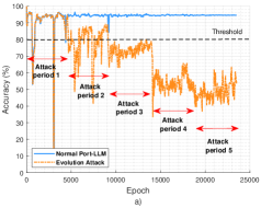 图5(a)说明了在进化攻击下模型准确率的演变,并与正常的Port-LLM进行了比较。在初始阶段,由于训练和测试过程同时进行,正常和受攻击的Port-LLM都表现出相似的波动。在此阶段,攻击仍然无效,因为对手的扰动策略尚未适应模型的行为。一旦训练收敛,正常模型保持约95%的稳定准确率,而受攻击模型在连续的攻击周期中开始显示出明显的性能下降。从第二个攻击阶段开始,与正常模型相比,受攻击的Port-LLM显示出清晰且一致的准确率下降,表明对手逐步改进了其基于梯度的扰动,并 increasingly 损害了模型的预测可靠性。