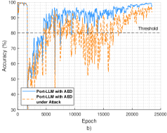 图5(b)显示了配备所提出AED的Port-LLM模型的性能。与正常的Port-LLM相比,带有AED的模型在训练期间收敛较慢,因为防御机制持续适应潜在的扰动。然而,一旦收敛实现,模型保持了稳定的性能,这表明AED引入了一种权衡:以较慢的收敛速度换取对自适应攻击更强的鲁棒性。