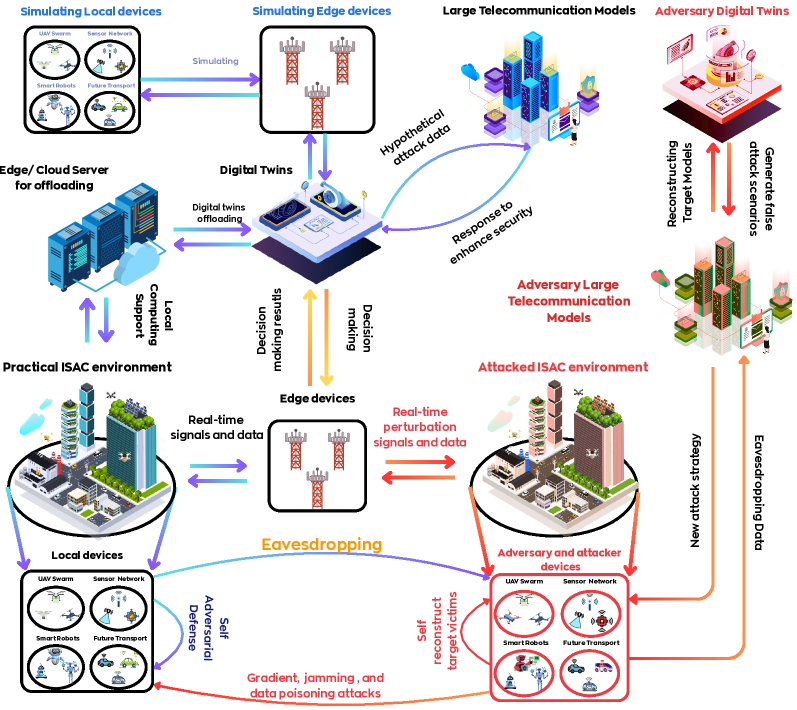 该框架建立在一个紧密耦合的感知、学习、生成和推理循环之上,该循环在设备、边缘服务器和云基础设施之间无缝运行。当存在对手时,他们也可以利用DT和LTM来生成复杂的攻击,导致攻击策略和防御机制之间的动态竞争。
