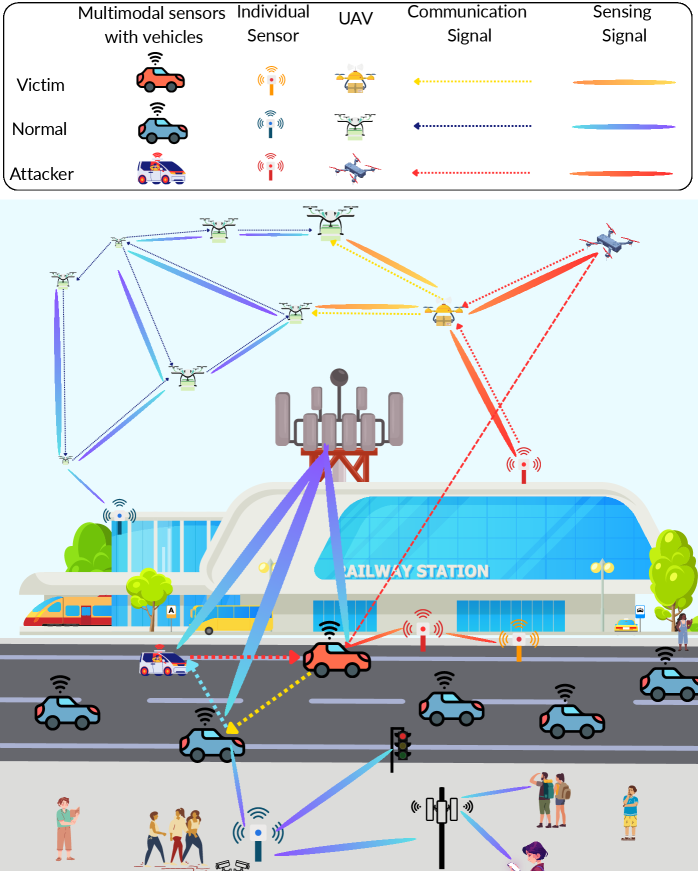 ISAC支持在共享无线电资源上进行传感和通信,使GenAI代理能够通过无线基础设施直接感知其物理环境[11062661]。这种协作允许在保持可靠连接的同时收集实时多模态数据,支持自动驾驶、机器人平台和工业自动化等应用。此外,多模态融合在这些环境中尤为关键,因为代理必须在不确定性下安全运行[xin2024novel]。然而,由于ISAC输出可以直接馈送到GenAI推理循环,即使是轻微的输入操纵也可能降低感知和控制能力。