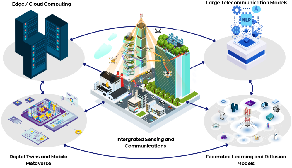 在本地层,诸如无人机、分布式传感器和工业机器人等设备持续产生实时多模态数据。这些数据在附近的边缘服务器进行处理以减少延迟和计算负担,并有选择地卸载到云服务器进行大规模分析和长期知识存储。DT提供物理环境的同步虚拟副本,实现预测建模、资源优化和服务的主动编排。与此相辅相成,LTM作为认知引擎,融合多模态流、控制信号、传感反馈和上下文提示,以提供高级推理和面向任务的决策支持。通过这种分层和互连的设计,数据在ISAC模块、边缘/云智能、DT和LTM之间无缝流动。因此,诸如无人机群、联网车辆和工业机器人等自主系统以更高的准确性、效率和响应能力运行,为可扩展和韧性的下一代无线服务奠定了基础。