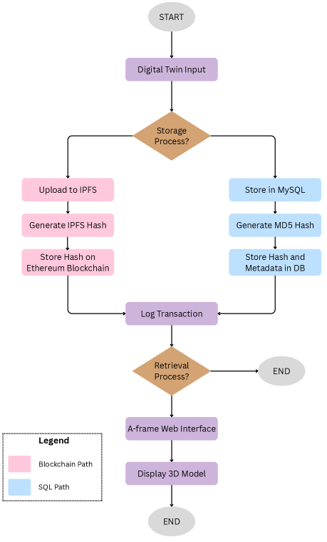 基于区块链的系统: 一个集成了星际文件系统(IPFS)[ipfsIPFSDocumentation] 用于去中心化存储的私有以太坊区块链网络 [buterin2013ethereum]。使用Solidity [wohrer2018smart] 开发的智能合约管理与区块链的交互。数字孪生文件通过Pinata.cloud固定服务 [pinataPinningService] 存储在IPFS上。核心思想是将大的数字孪生文件链下存储在IPFS上,并仅将其不可变的IPFS哈希及相关元数据记录在区块链上。