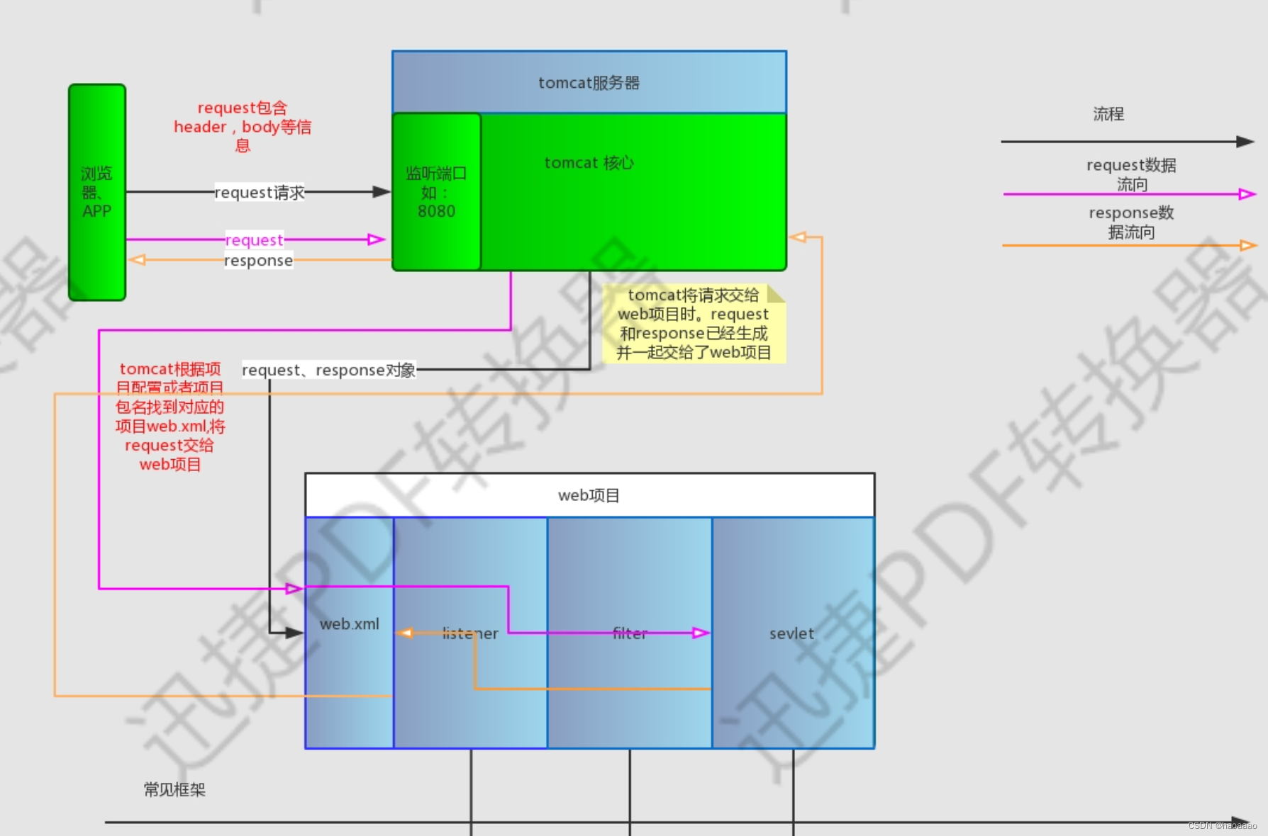 ---通过端口进入tomcat,再由tomcat将携带的请求信息移交给web项目。
