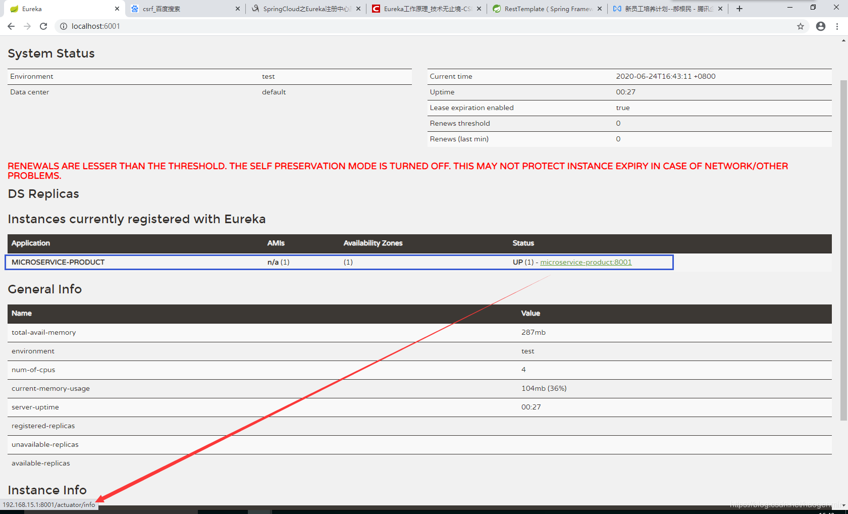 可以发现注册中心已经有了注册信息,我们把鼠标放在绿色的连接上面发下左下角显示的ip和端口,其实就是我们在配置文件里面配置的这个玩意。
