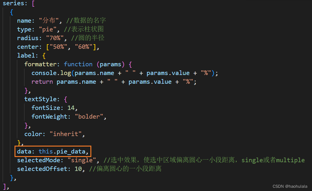 可以看到数据是一个列表,每个列表项都包含了name和value两个值,其中name代表种类,value代表数值,最后绘制的时候会按照百分比在饼图中进行划分。