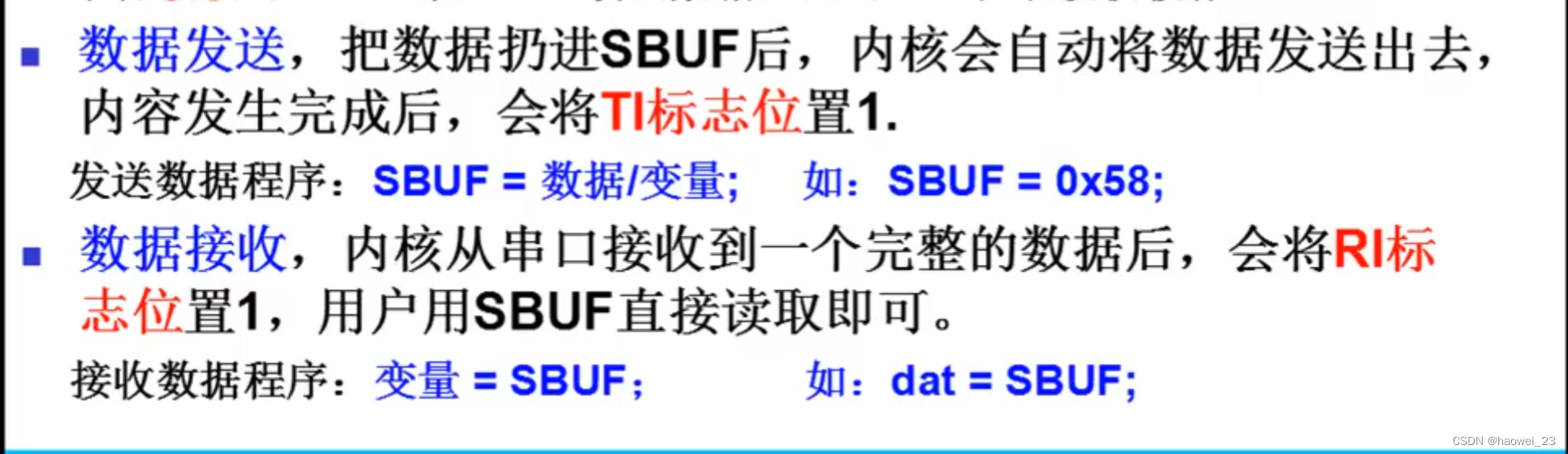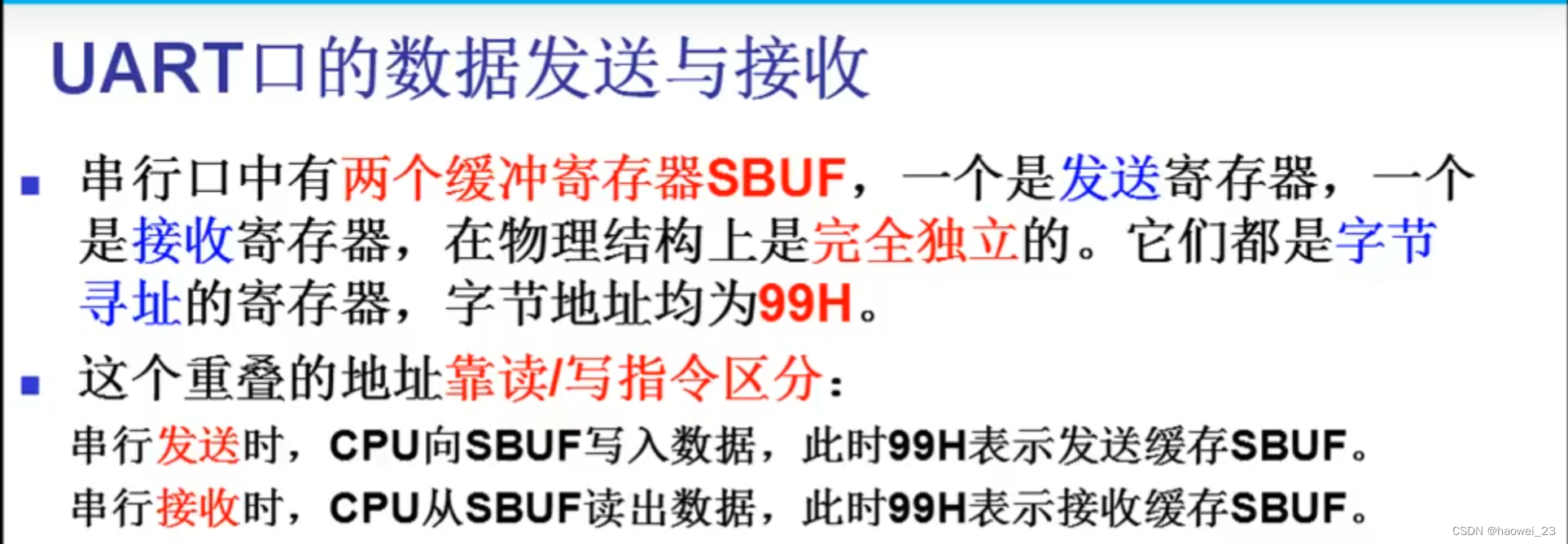 说明:1.一个SBUF,对应俩个寄存器。只能一个字节写入和读出,不能进行位操作。