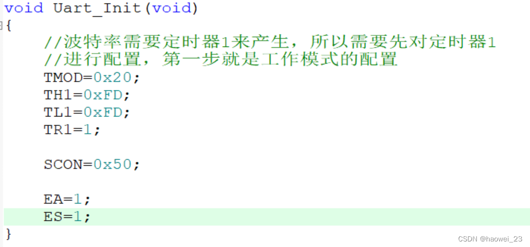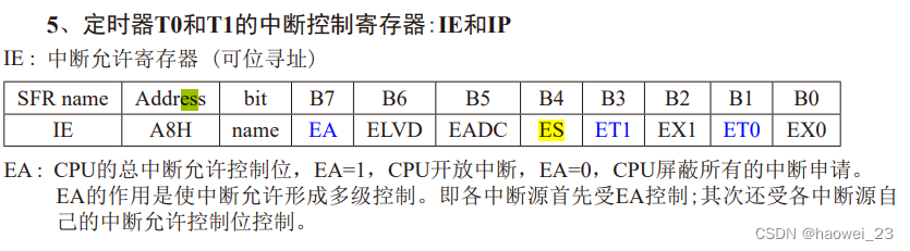 我们后面有中断函数的,配置必不能少了这部分。视频里面说有一个总中断EA要置1打开;还有一个自己的中断标志位ES要置1,应该就是如数据手册里面说的一样。