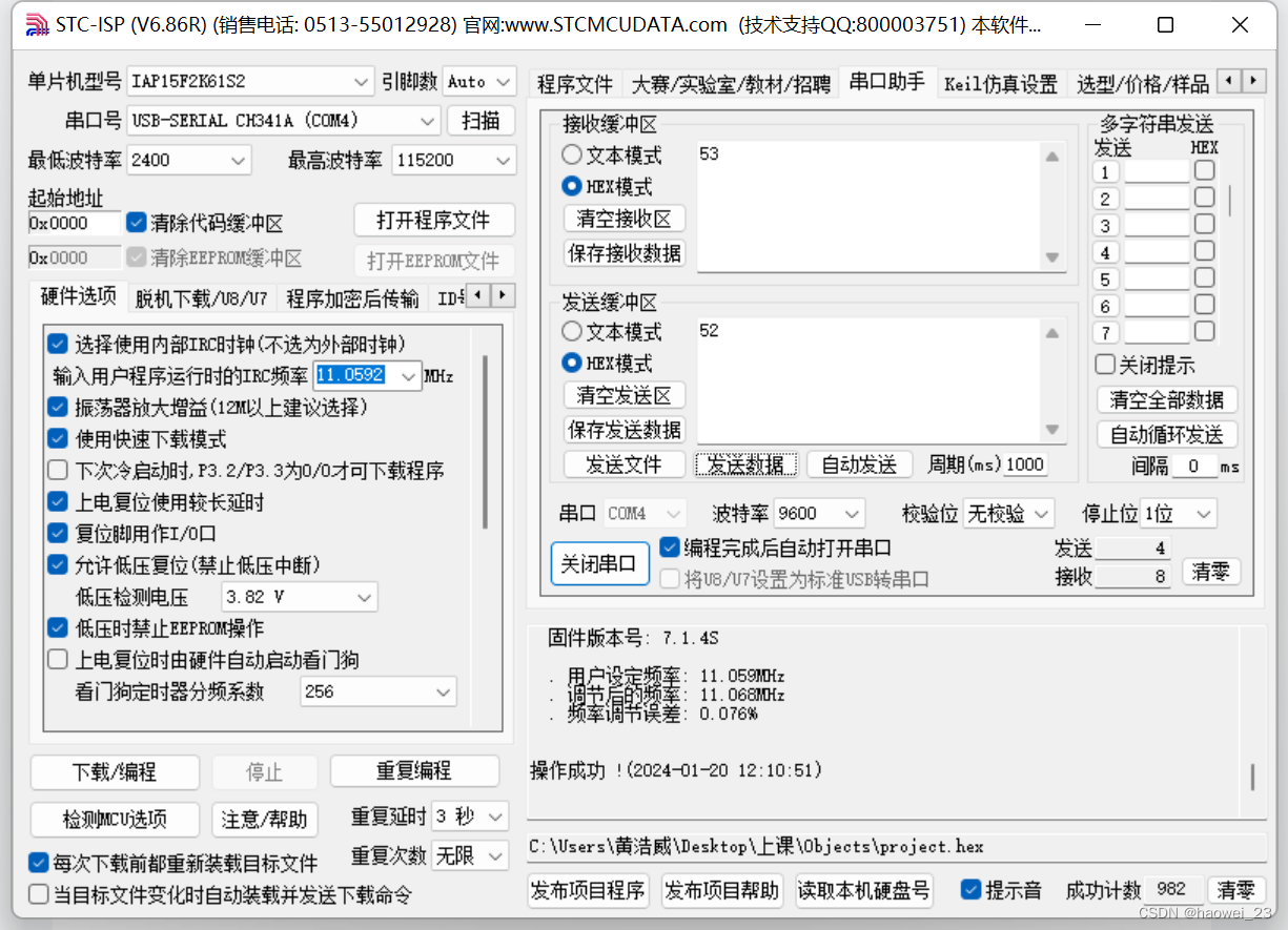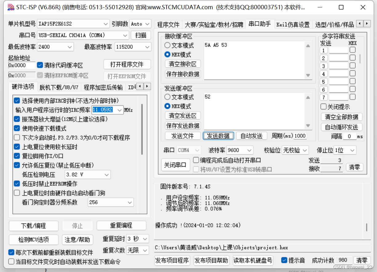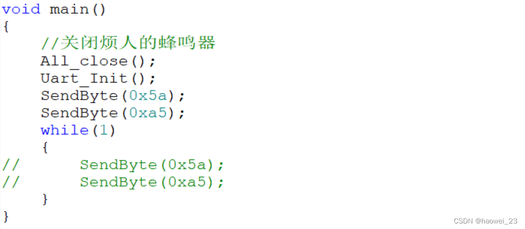 说明:1.作者一开始因为写错了,找了很久,发现代码没问题后,意外发现下面这个实验现象的解决办法(实验现象表示不会在打开串口后执行我们main里面俩个发送字节函数的指令,但是我们发送数据,发送字节函数依旧可以正常使用)。