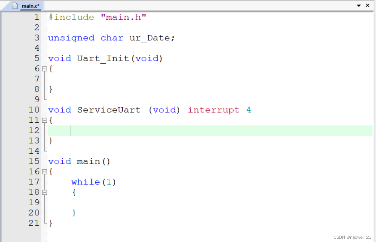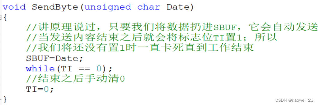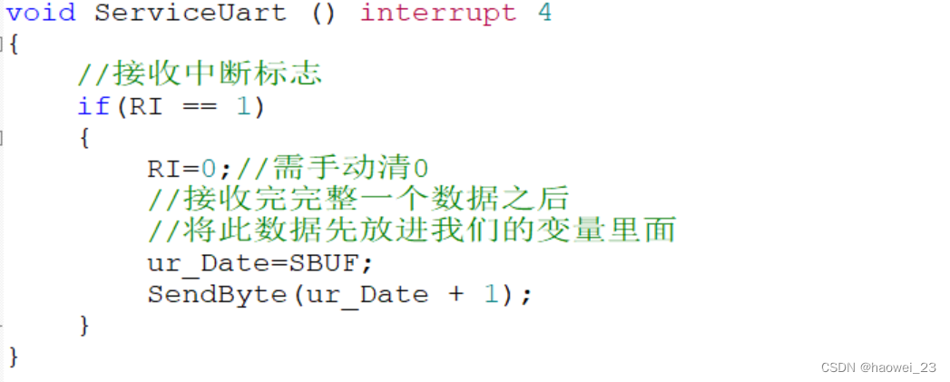 说明:1.中断序号前面已经说明了;2.RI是接收到完整数据时的标志位;3.SBUF寄存器用来存数据;4.ur_Date这个自定义的变量用来存放接收到的数据;5.把发送字节函数放在此中断之前
