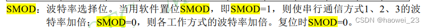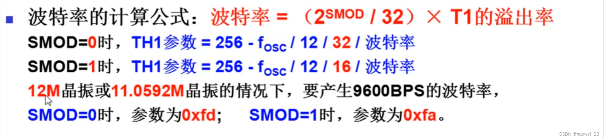 最重要的就是波特率的计算了。第一个公式作了解就行,要记住下面SMOD俩种情况对应的参数计算方式,或者直接记住俩种模式下的参数值。一般是使用这俩个值的。