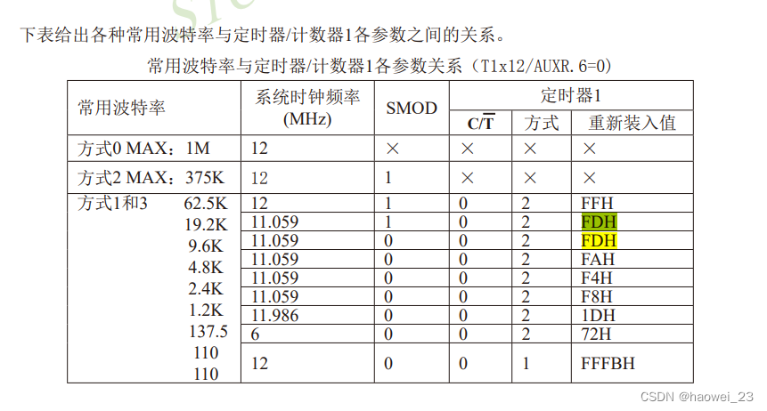 也可以查手册,所以数据手册还是很实在的。可以看到9.6K也就是9600波特率对应的重新装入值是FD,然后对应TH1和TL1值是一样的。(12兆选择FD会有误差,但是是允许的)