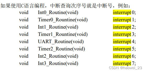 3.中断函数是用来产生波特率的,中断序号可以查 (放下面了,0是外部中断0;1是定时器0;2是外部中断1;3是定时器1;4就是我们要用到的串口中断,写多就记住了)