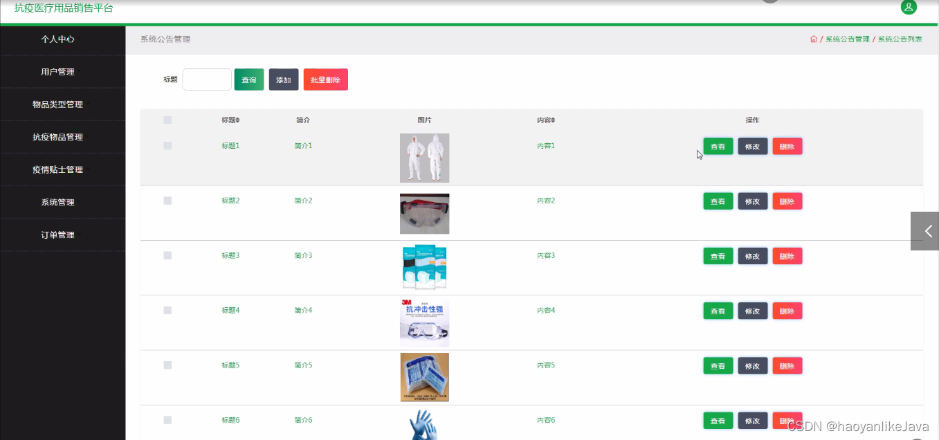 系统公告管理,在系统公告管理页面可以查看标题、简介、图片、内容等信息进行修改、删除,如图5-17所示。