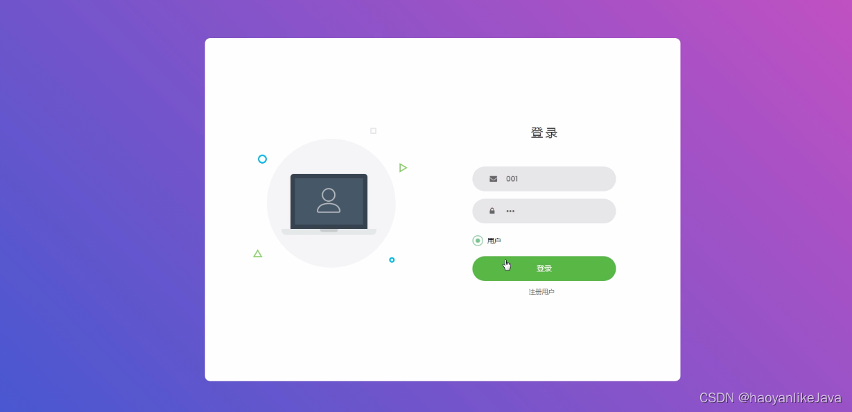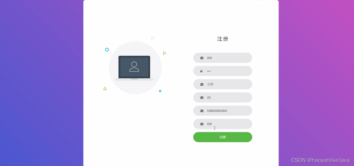 用户登录、用户注册,通过注册填写账号、用户、年龄、手机、邮箱等信息进行注册、登录操作,如图5-2所示。