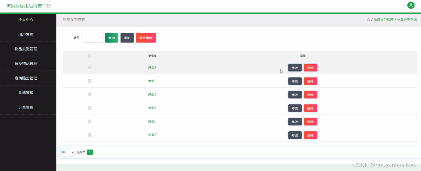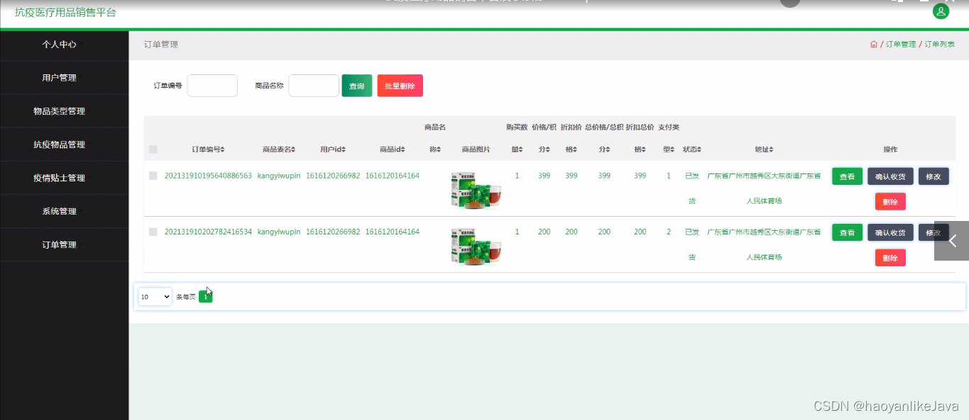 通过对标签进行分级管理,实现了管理员的功能;个人中心,用户管理,商品种类管理,防疫用品管理,防疫小贴士管理,系统管理,订单管理,用户前台;首页、抗疫物品、疫情贴士、新闻资讯、我的、跳转到后台、购物车、客服等信息管理功能,从而实现对对抗疫医疗用品销售平台信息的有效管理。