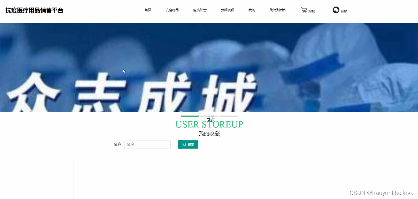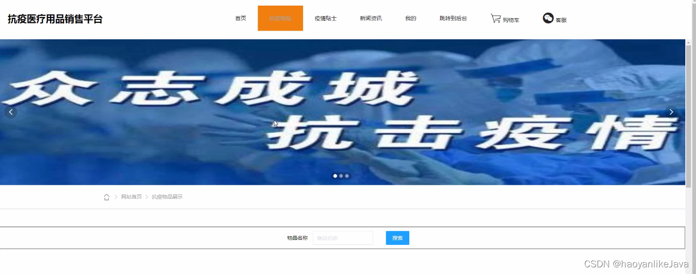 抗疫医疗用品销售平台,在抗疫医疗用品销售平台可以查看首页、抗疫物品、疫情贴士、新闻资讯、我的、跳转到后台、购物车、客服等内容,如图5-1所示。