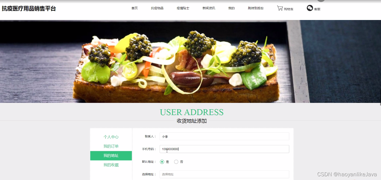 收货地址添加,在收货地址添加页面可以填写联系人、手机号码、默认地址、选择地址等信息进行添加如图5-5所示。