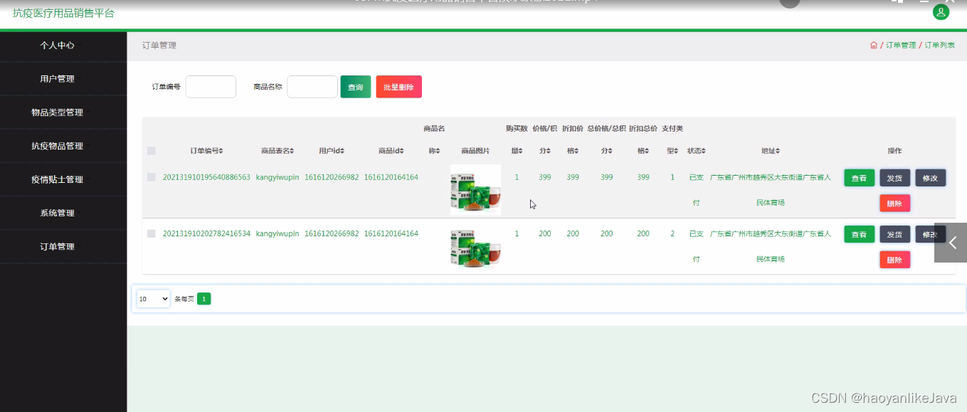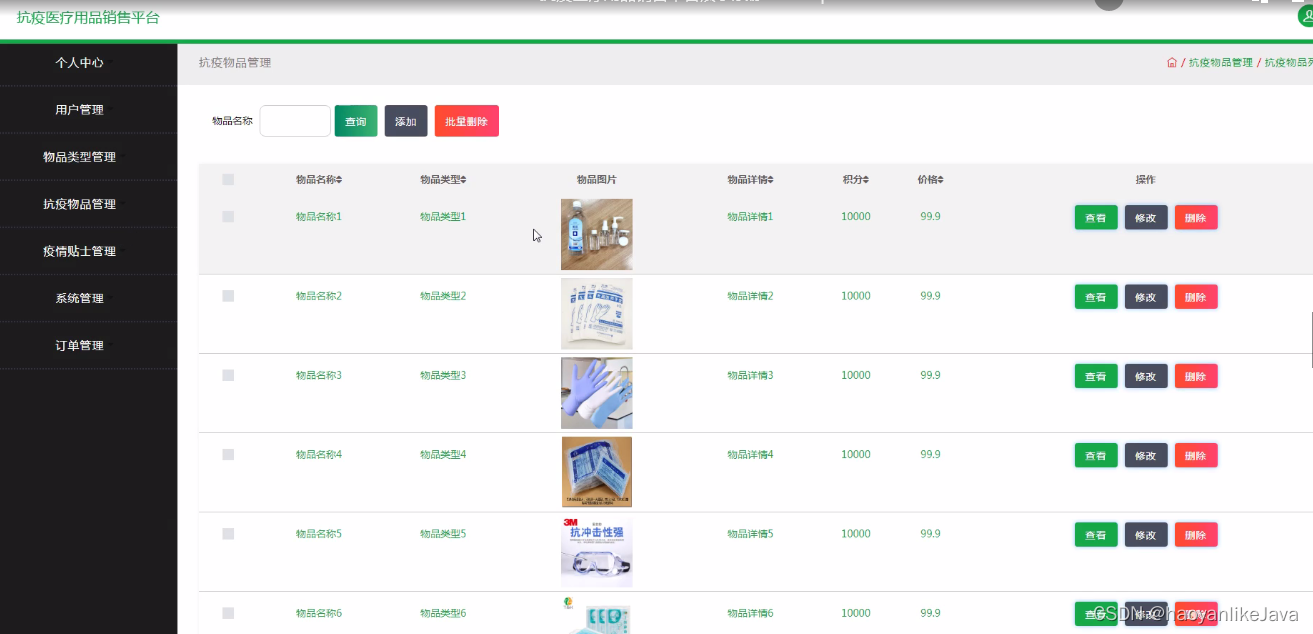 抗疫物品管理,在抗疫物品管理页面可以查看物品名称、物品类型、物品图片、物品详情、积分、价格等信息进行修改、删除,如图5-14所示。