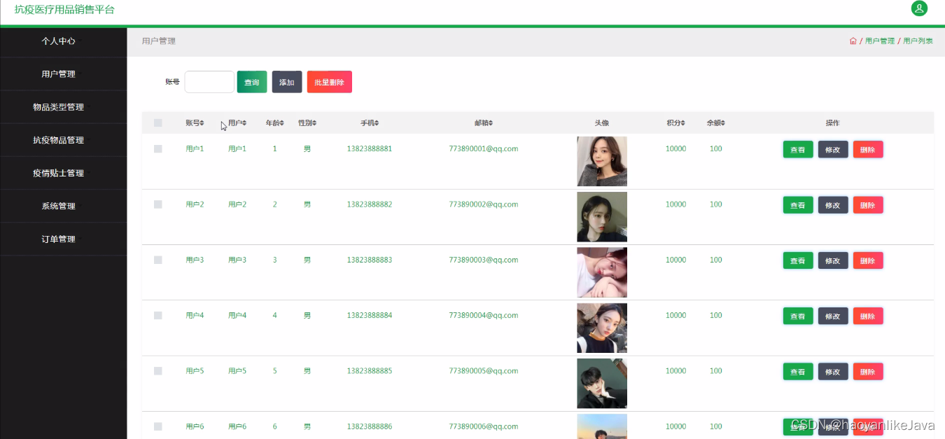 用户管理,通过查看账号、用户、年龄、性别、手机、邮箱、头像、积分、余额等信息进行查看、修改、删除操作,如图5-12所示。