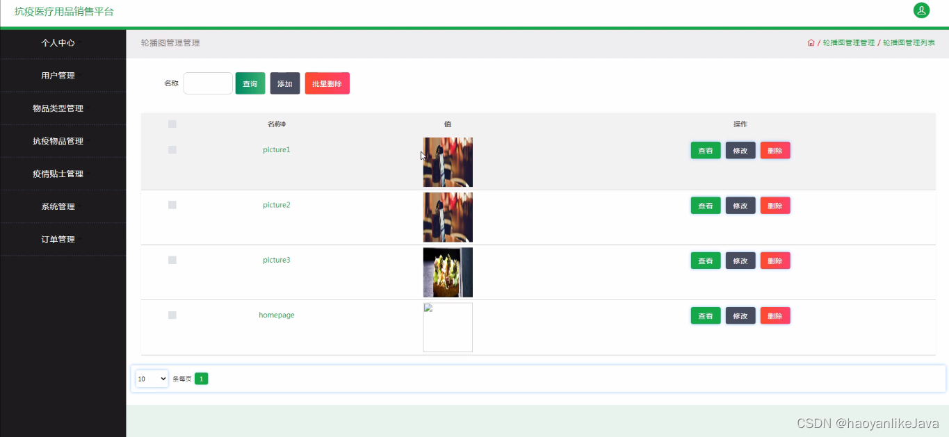 轮播图;该页面为轮播图管理界面。管理员可以在此页面进行首页轮播图的管理,通过新建操作可在轮播图中加入新的图片,还可以对以上传的图片进行修改操作,以及图片的删除操作,如图5-16所示。