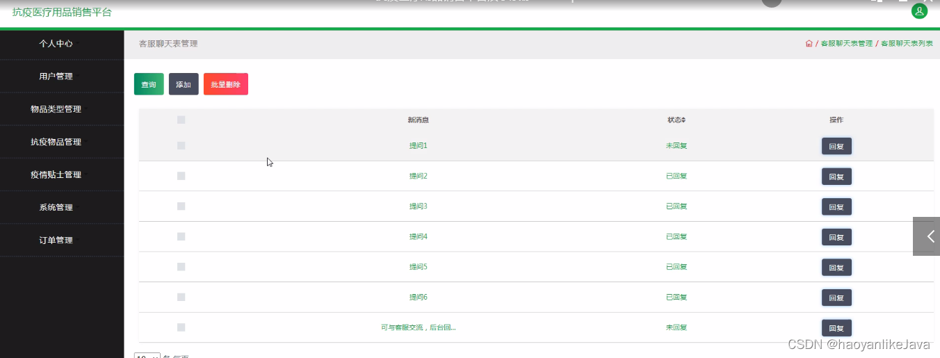 客服聊天表管理,在客服聊天表管理页面可以查看新消息、状态等信息进行回复,如图5-18所示。