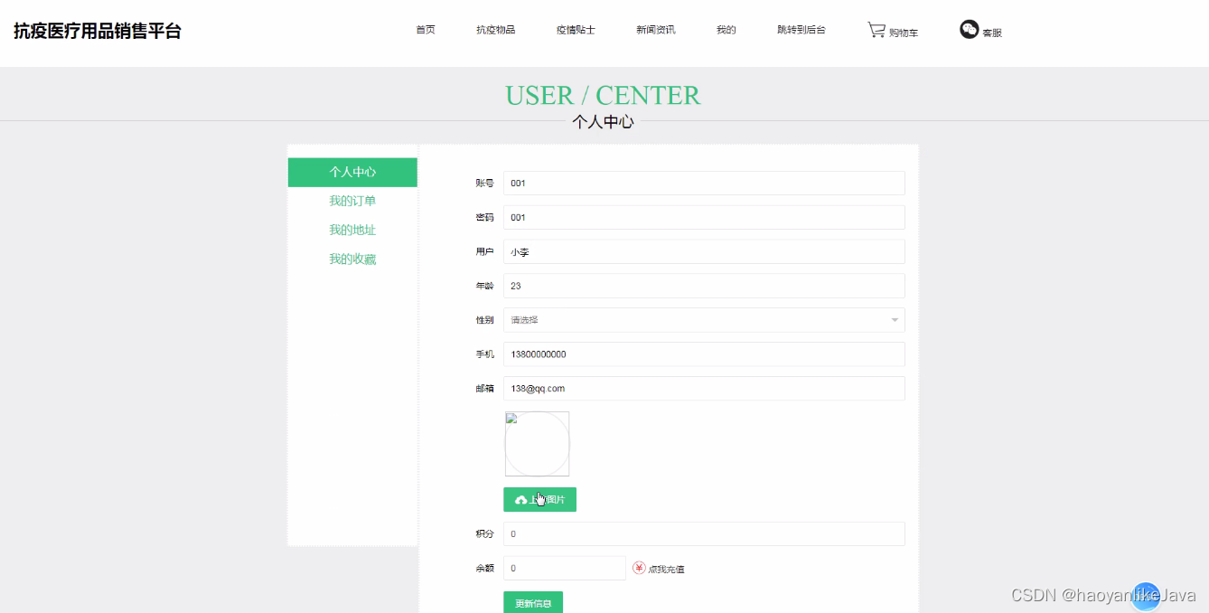 个人中心,在个人中心页面可以填写账号、密码、用户、年龄、性别、手机、邮箱、头像、积分、余额等信息进行更新信息、退出登录如图5-4所示。