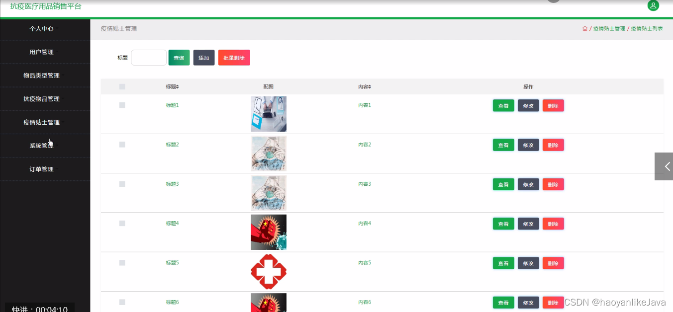 疫情贴士管理,在疫情贴士管理页面可以查看标题、配图、内容等信息进行修改、删除,如图5-15所示。