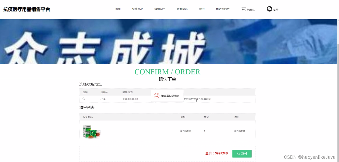 确认下单,在确认下单页面可以填写选择收货地址、清单列表等信息进行支付如图5-6所示。