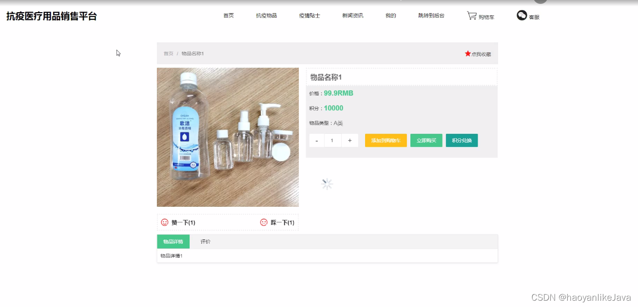 抗疫物品,在抗疫物品页面可以查看物品名称、物品类型、物品图片、物品详情、积分、价格等信息进行添加到购物车、立即购买、积分兑换,如图5-3所示。