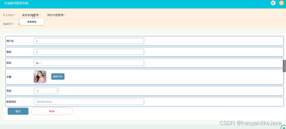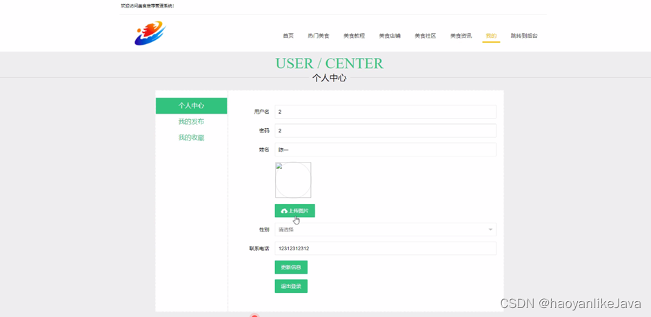 用户登录进入美食推荐管理系统可以查看个人中心、美食教程管理、我的收藏管理等内容。