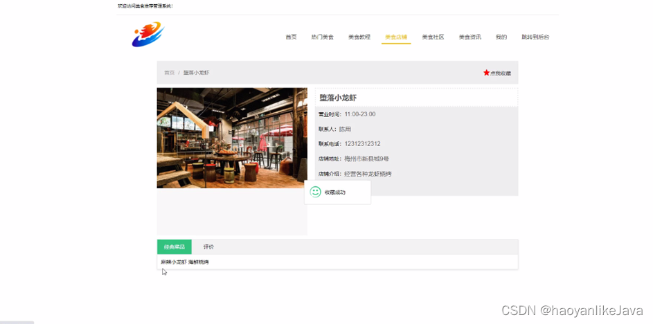 个人中心,在个人中心页面通过填写用户名、密码、姓名、头像、性别、联系电话等信息更新信息、退出登录,如图5-5所示。在美食店铺页面通过查看店铺名称、图片、营业时间、联系人、联系电话、店铺地址、店铺介绍、经典菜品等信息进行点我收藏操作,如图5-6所示。