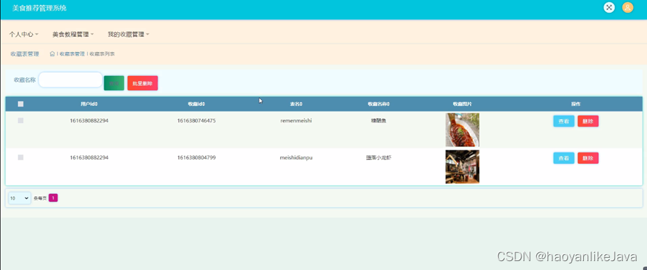 我的收藏管理,在我的收藏管理页面中可以查看用户id、收藏id、表名、收藏名称、收藏图片等信息,并且根据需要对已有我的收藏管理进行查看删除等其他详细操作,如图5-16所示。