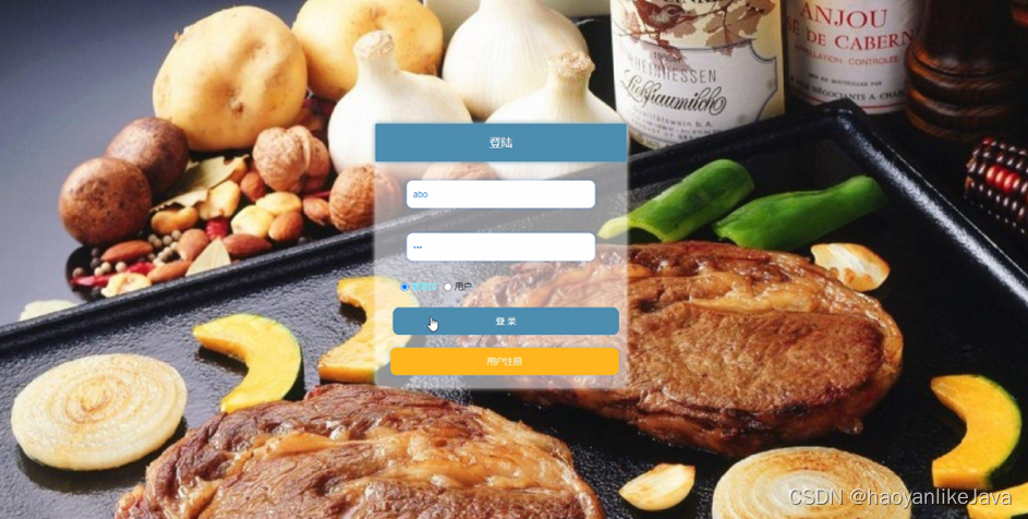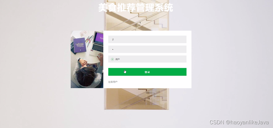 用户登录,在登录页面通过填写账号、密码等信息完成登录,如图5-3所示。在热门美食页面通过查看美食名称、分类、图片、材料、美食特色等信息进行点我收藏操作,如图5-4所示。