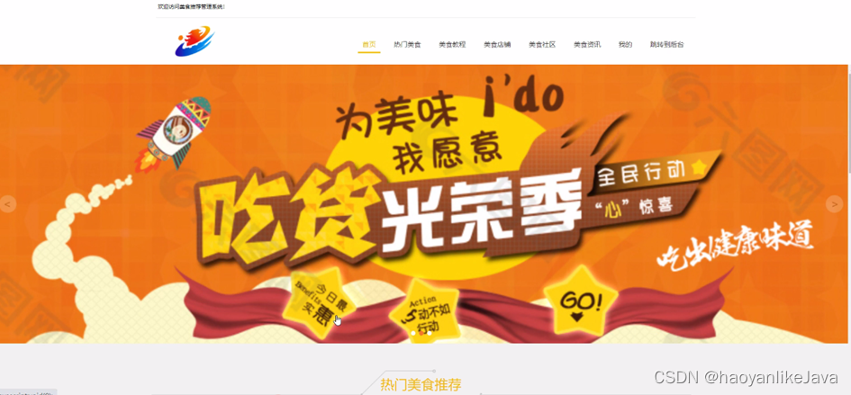 美食推荐管理系统,在系统首页可以查看首页、热门美食、美食教程、美食店铺、美食社区、美食资讯、我的、跳转到后台等内容,如图5-1所示。