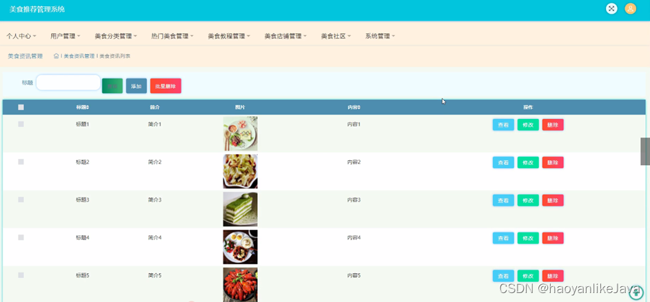 美食资讯管理,在美食资讯管理页面中可以查看标题、简介、图片、内容等内容,并且根据需要对已有美食资讯管理进行详情,修改或删除等详细操作,如图5-12所示。