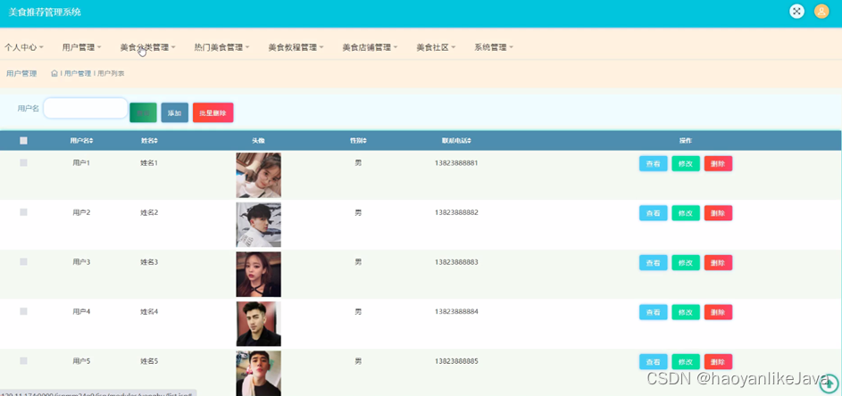 用户管理,在用户管理页面中可以通过查看用户名、姓名、头像、性别、联系电话等内容进行修改、删除,如图5-8所示。还可以根据需要对美食分类管理进行详情,修改等详细操作,如图5-9所示。