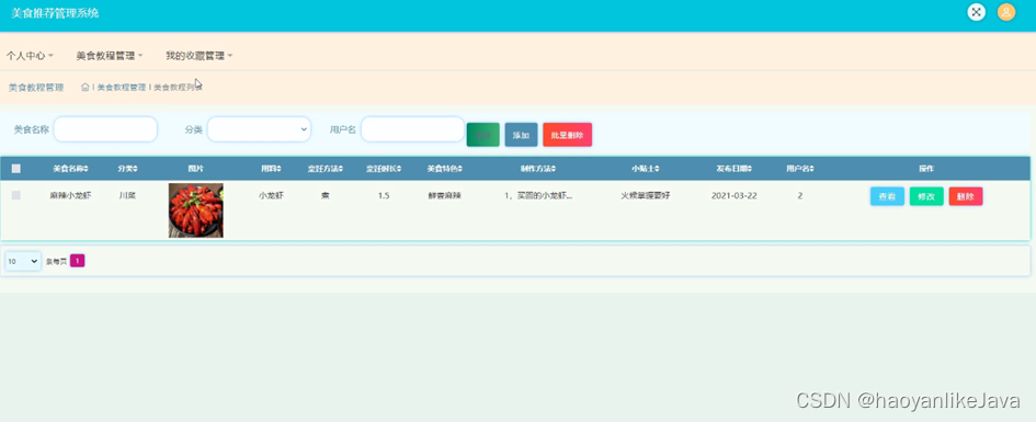 美食教程管理,在美食教程管理页面中可以查看美食名称、分类、图片、用料、烹饪方法、烹饪时长、美食特色、制作方法、小贴士、发布日期、用户名等信息,并且根据需要对已有美食教程管理进行查看删除等其他详细操作,如图5-15所示。