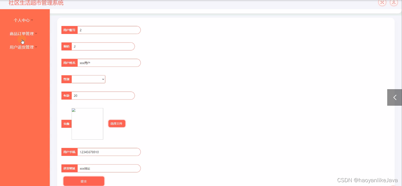 个人信息,在个人信息页面通过查看用户账号、密码、用户姓名、性别、年龄、头像、用户手机、送货地址等信息进行修改如图5-13所示。