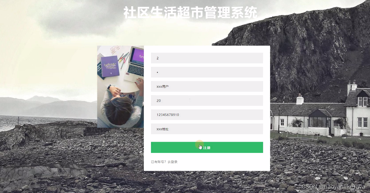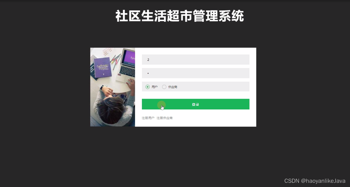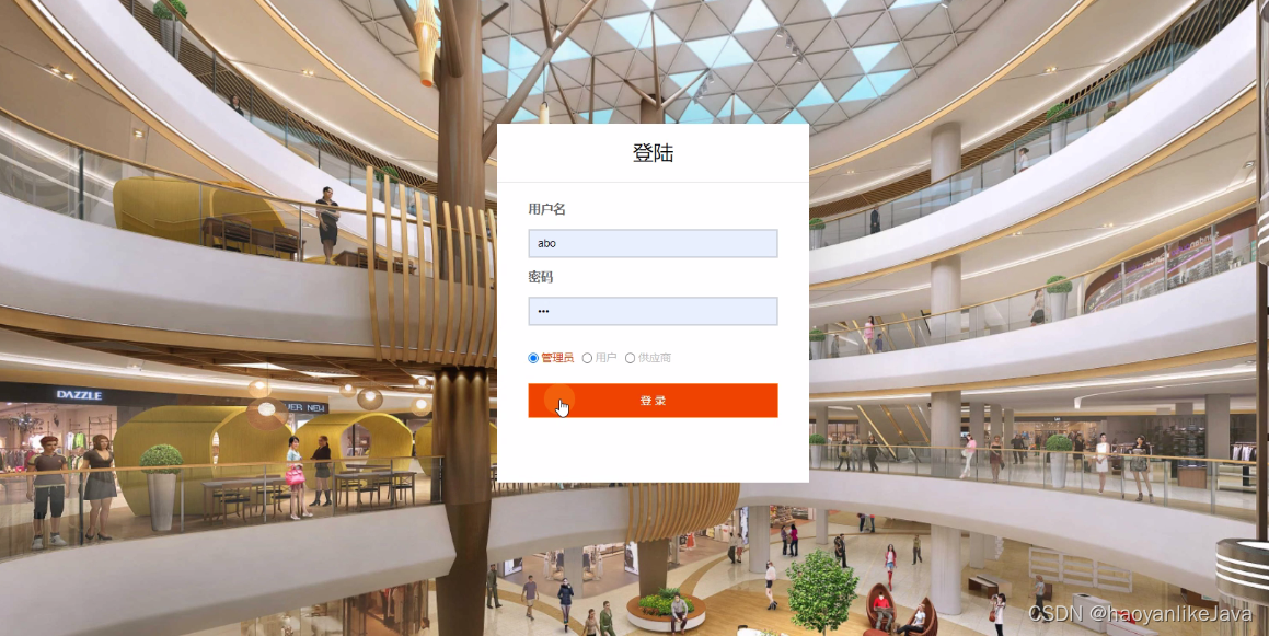 管理员登录,通过填写用户名、密码等信息,输入完成后选择登录即可进入社区生活超市管理系统 ,如图5-5所示。