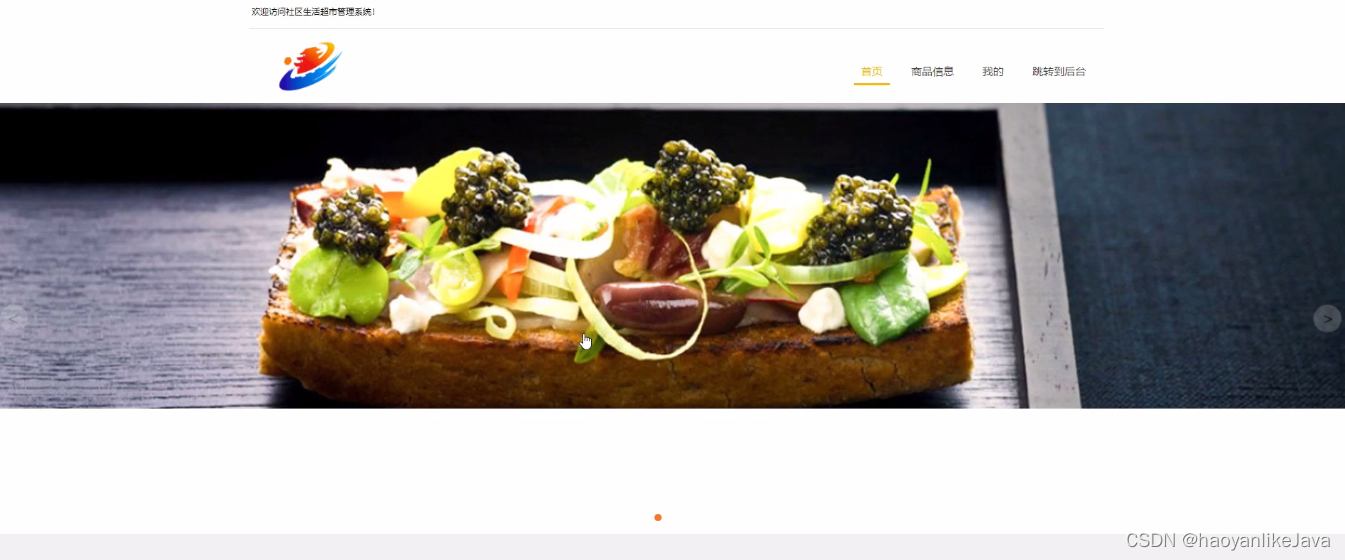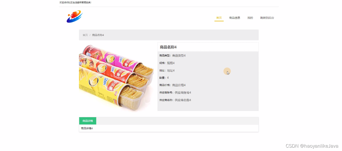 社区生活超市管理系统 ,在社区生活超市管理系统可以查看首页、商品信息、我的、跳转到后台等内容,如图5-1所示。