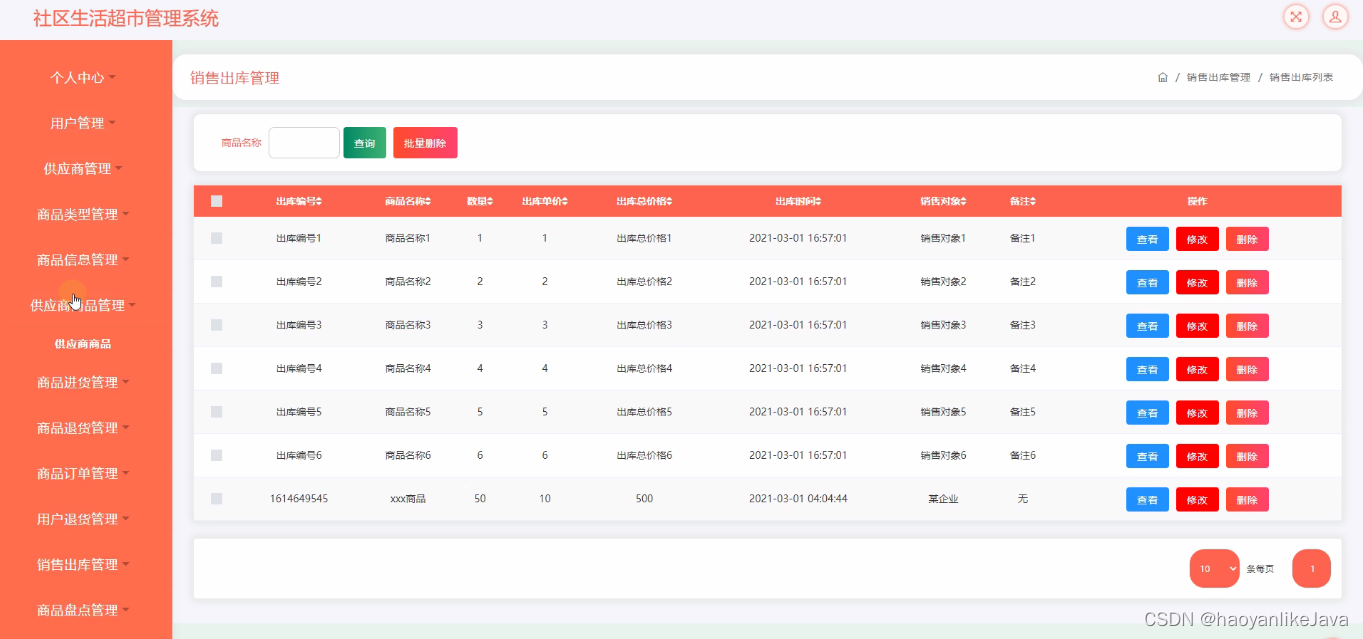 销售出库管理,在销售出库管理页面可以查看出库编号、商品名称、数量、出库单价、出库总价格、出库时间、销售对象、备注等信息进行查看、修改、删除,如图5-10所示。