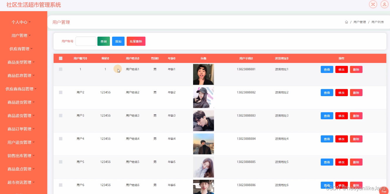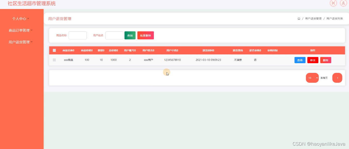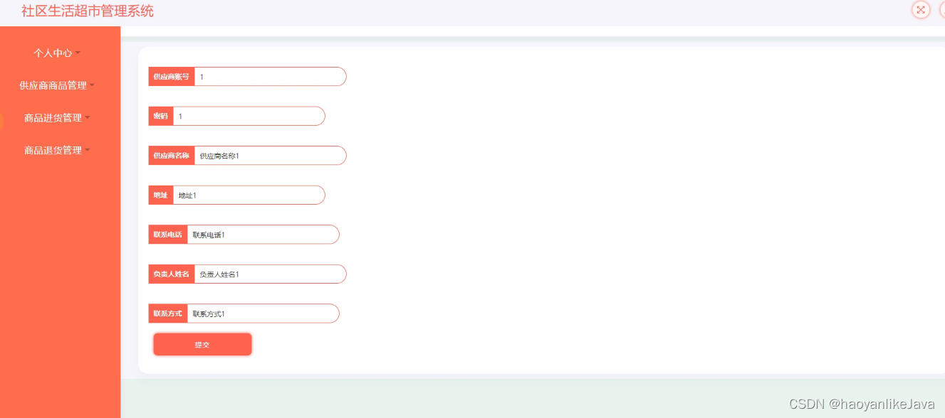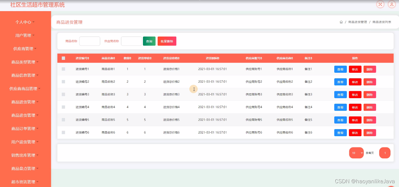 这一选择的目的是要通过分门别类的标签管理,实现管理员的功能;个人中心,用户管理,供应商管理,货物种类管理,货物信息管理,供应商货物管理,货物进货管理,货物退货管理,货物订单管理,顾客退货管理,货物出库管理,货物盘点管理,超市信息管理,系统管理,供应商;个人中心,供应商货物管理,货物进货管理,货物返回管理,使用;个人中心,商品定单管理,用户返利管理,前台主页;首页、商品信息、我的、跳转到后台等信息管理功能,从而实现对社区生活超市管理系统信息的有效管理。