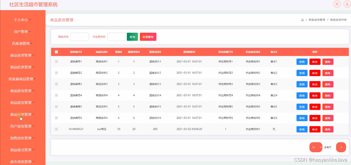 商品退货管理,在商品退货管理页面可以查看退换编号、商品名称、数量、退换单价、退换总价、退换时间、供应商账号、供应商名称、备注等信息进行查看、修改、删除,如图5-11所示。