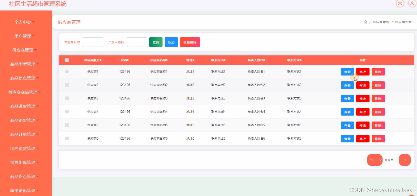 供应商管理,通过填写供应商账号、密码、供应商名称、地址、联系电话、负责人姓名、联系方式等信息进行查看、修改、删除操作,如图5-7所示。