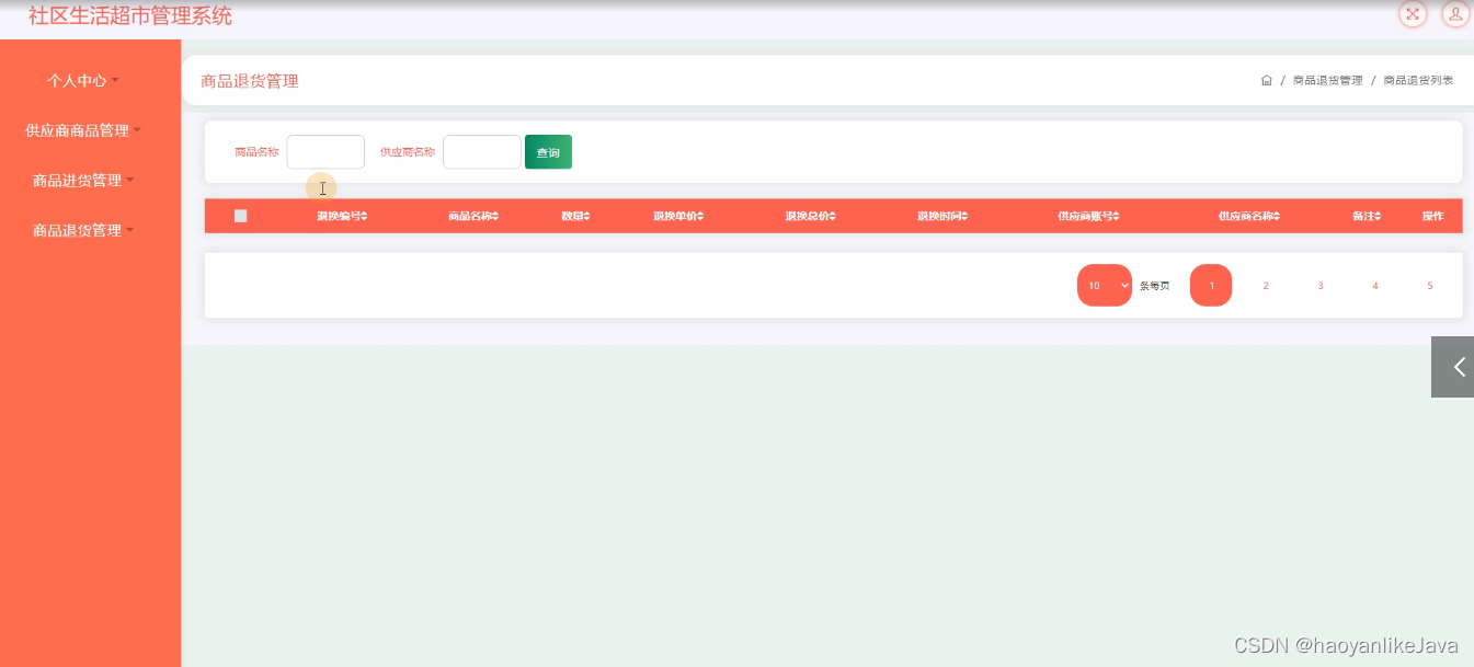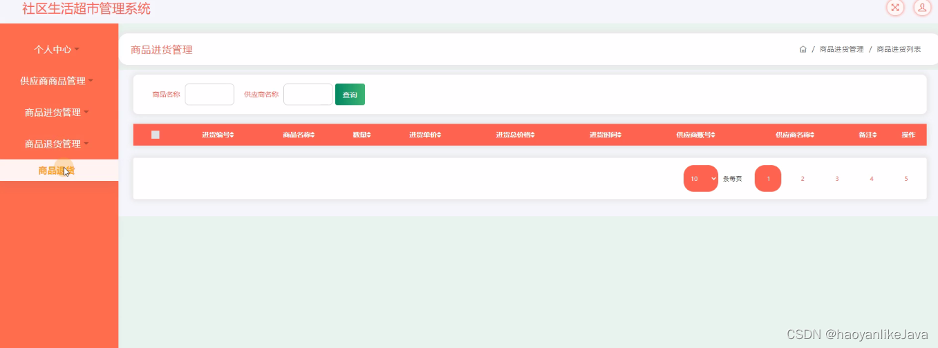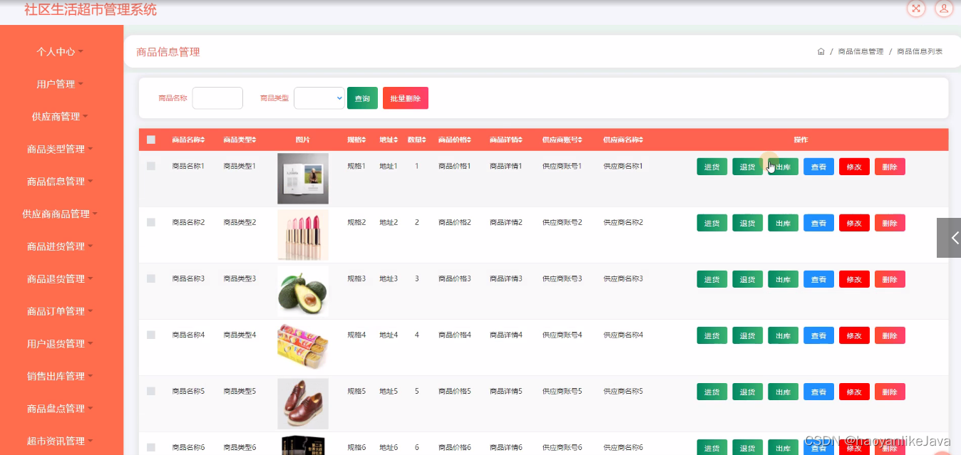 社区生活超市管理系统 ,在社区生活超市管理系统可以查看个人中心、用户管理、供应商管理、商品类型管理、商品信息管理、供应商商品管理、商品进货管理、商品退货管理、商品订单管理、用户退货管理、销售出库管理、商品盘点管理、超市资讯管理、系统管理等内容,如图5-6所示。