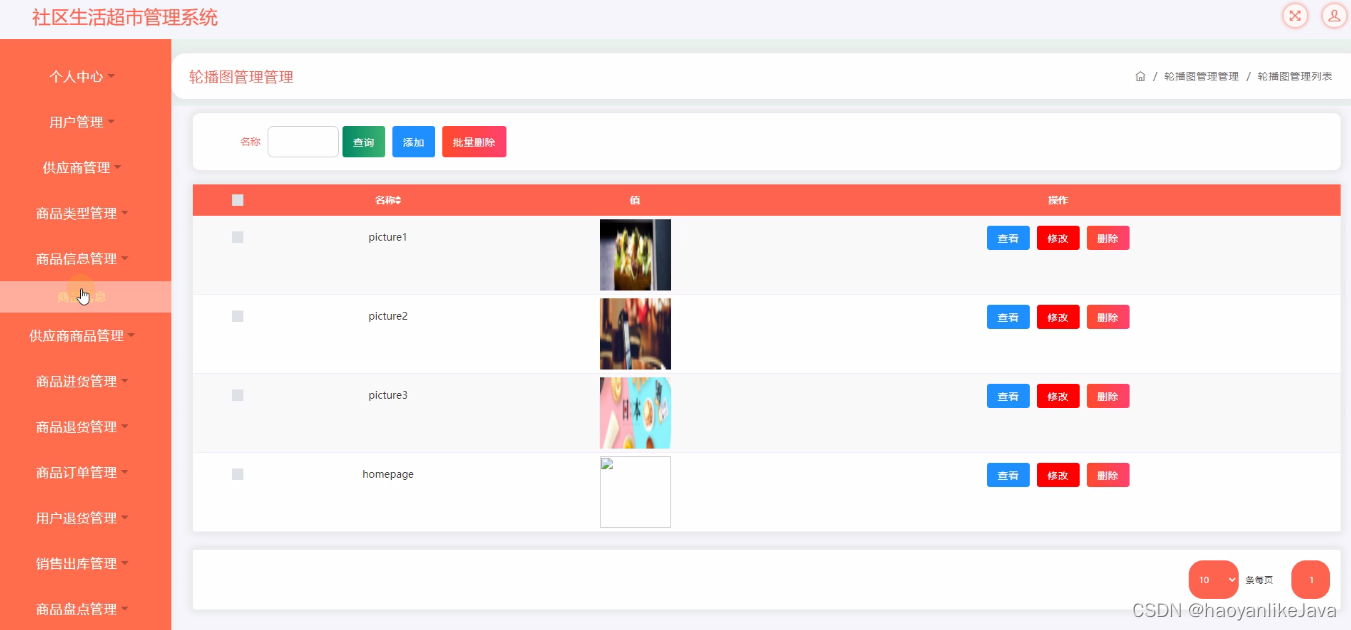 轮播图;该页面为轮播图管理界面。管理员可以在此页面进行首页轮播图的管理,通过新建操作可在轮播图中加入新的图片,还可以对以上传的图片进行修改操作,以及图片的删除操作,如图5-12所示。